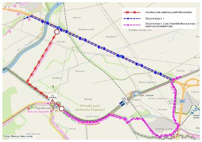 VARIANTA č. 1: podjedete na kole most přes silnici I/55 a vyjedete nahoru na silnici. Dáte se doleva a po silnici I/55 pokračujete cca 3 km, přejedete most přes Moravu a následně zahnete doleva a pokračujete po původní cyklotrase podél Baťova kanálu (Moravská stezka) až do Rohatce a Hodonína.MAPA: 1url.cz