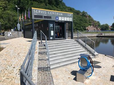 Unikátní řešení představuje integrace veškerých technologií včetně nádrže na 25 m3 nafty a benzínu a výdejních stojanů s hadicemi délky 12 m do jediného kontejneru. V případě velké povodně, kdy může být prostor přístavu ohrožen zatopením, se celý kontejner jeřábem naloží a odveze a k žádnému znečištění vody pak nemůže dojít. Ovládání je samoobslužné pomocí tankomatu s platbou bankovní kartou. Stanice je designově opláštěna, aby citlivě zapadla do pohledově exponovaného prostoru přímo pod zámkem.