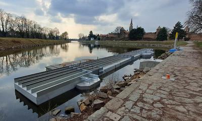 Základní konstrukce mola pro malá plavidla v Nymburce je na svém místě! Ve dvou částech ji tam dnes přepravil nízkoponorový tlačný remorkér.