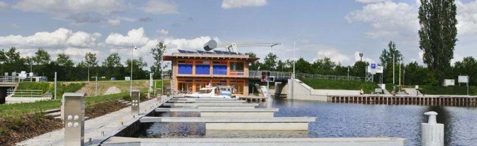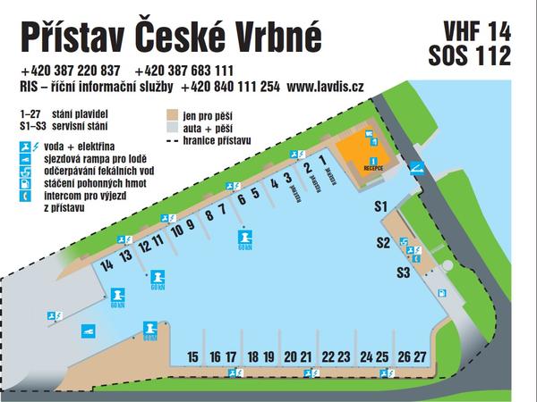 Přístav zajišťuje prostor pro bezpečné stání 27 malých plavidel (13 délky až 12 m a 14 délky až 9 m) a min. 2 osobních lodí za vysokých vodních stavů i mimo plavební sezónu. Je v něm vytvořeno zázemí pro běžný provoz lodí a servisní centrum. V přístavu se nachází budova kapitanátu, ve které sídlí správa přístavu a je v ní umístěna i sprcha a sociální zařízení. Všechna stání jsou vybavena přípojkou elektřiny a vody v samoobslužných odběrných sloupcích. Dále je k dispozici skluz pro lodě a jeřáb s nosností 10 t (po předchozí domluvě se správcem přístavu). V servisním centru je možné odčerpat odpadní a nádní vody a do budoucna se zde počítá i s čerpací stanicí pohonných hmot. Součástí přístavu je také unikátní sklopný most, který umožňuje skloubit provoz lodí s výškou až 5,25 m a pozemní dopravy. Standardně je most sklopen. Zdvihá se pouze při průjezdu lodě vyšší než 2,9 m na základě požadavku posádky prostřednictvím intercomu umístěného na čekacím stání plavební komory nebo u výjezdu z přístavu, popř. telefonem nebo VHF.